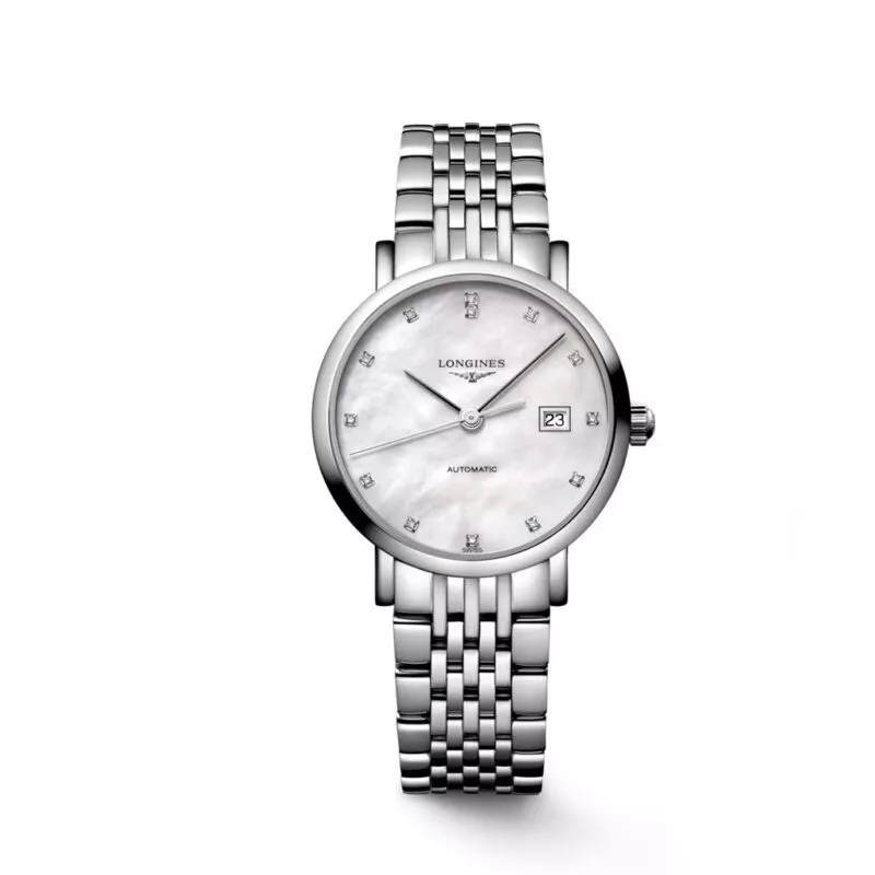 Orologio Longines Elegant Collection con cassa da 29 mm. Quadrante madreperla bianca con diamanti. Movimento a carica automatica.