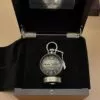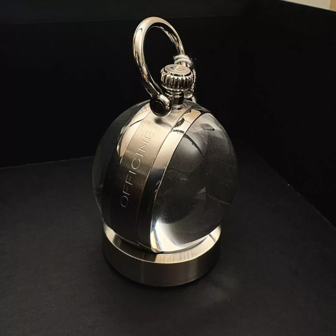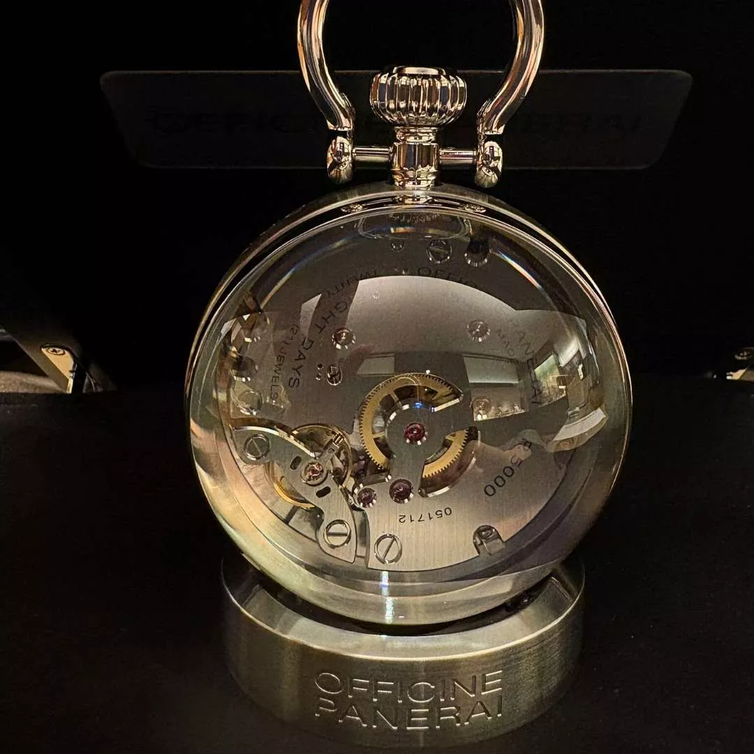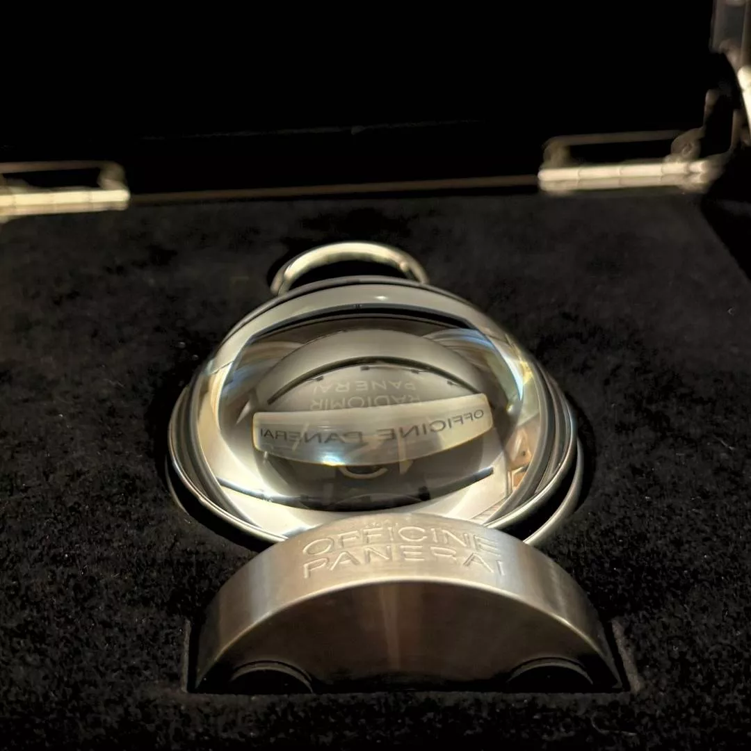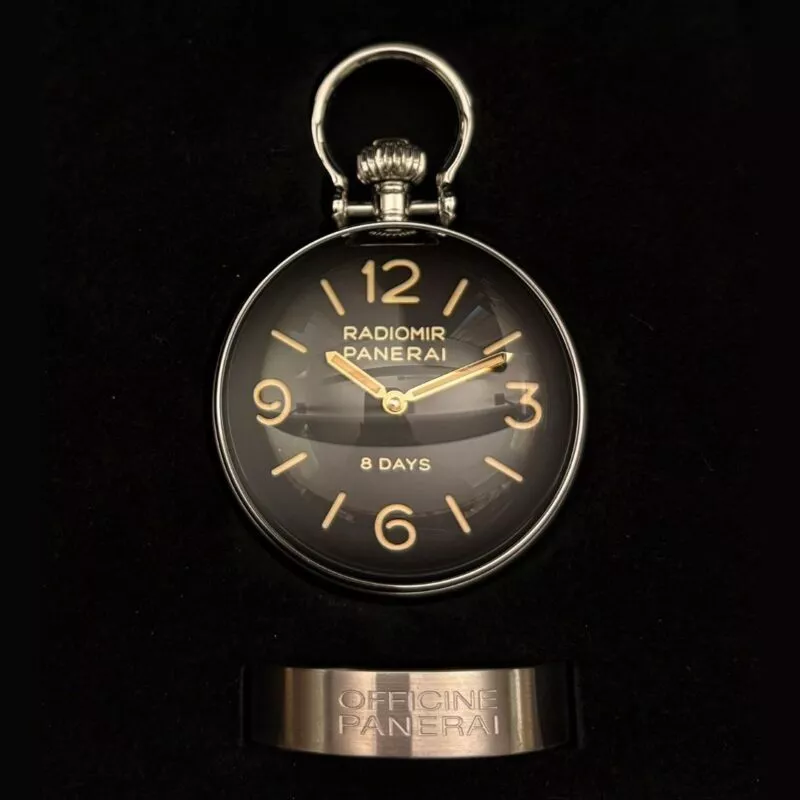 Orologio da tavolo Panerai in acciaio con quadrante nero e movimento manuale.