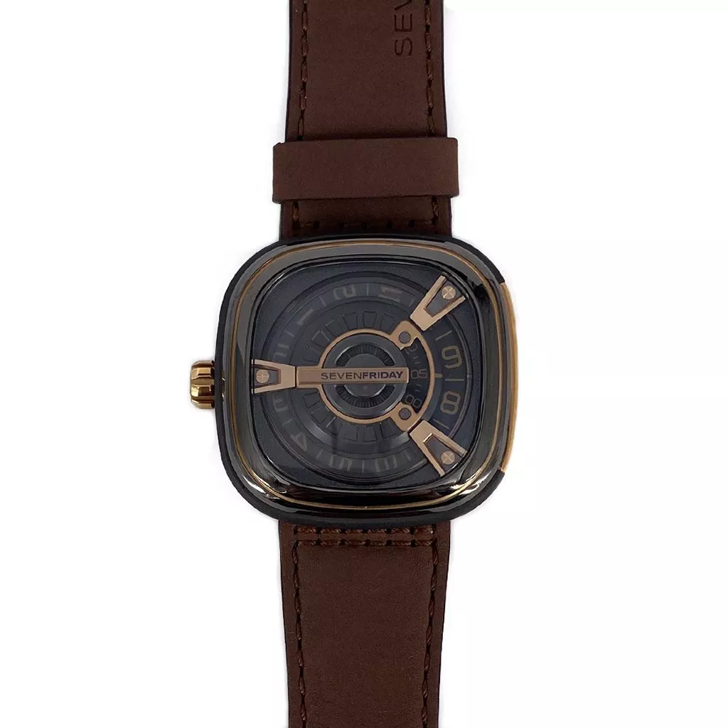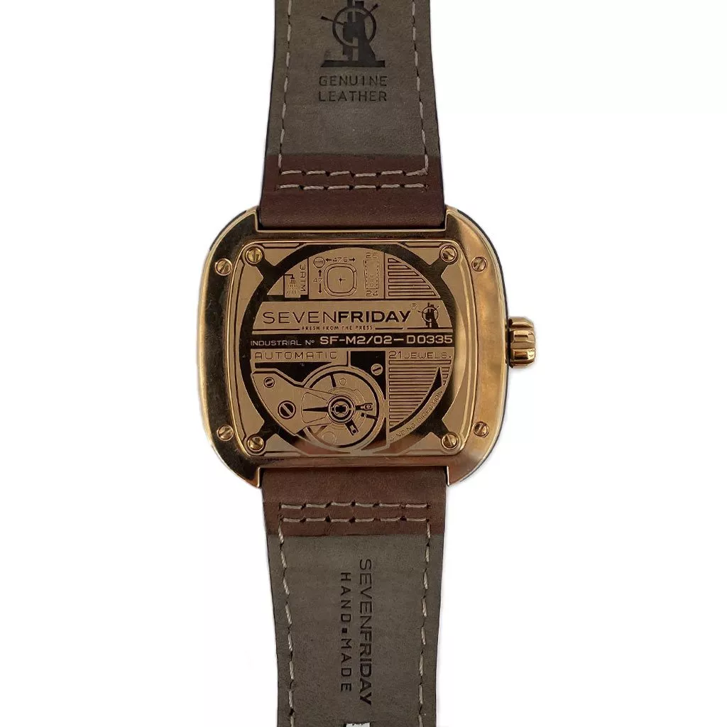 Orologio SevenFriday serie M con cassa in acciaio e cinturino in pelle marrone. Carica automatica.