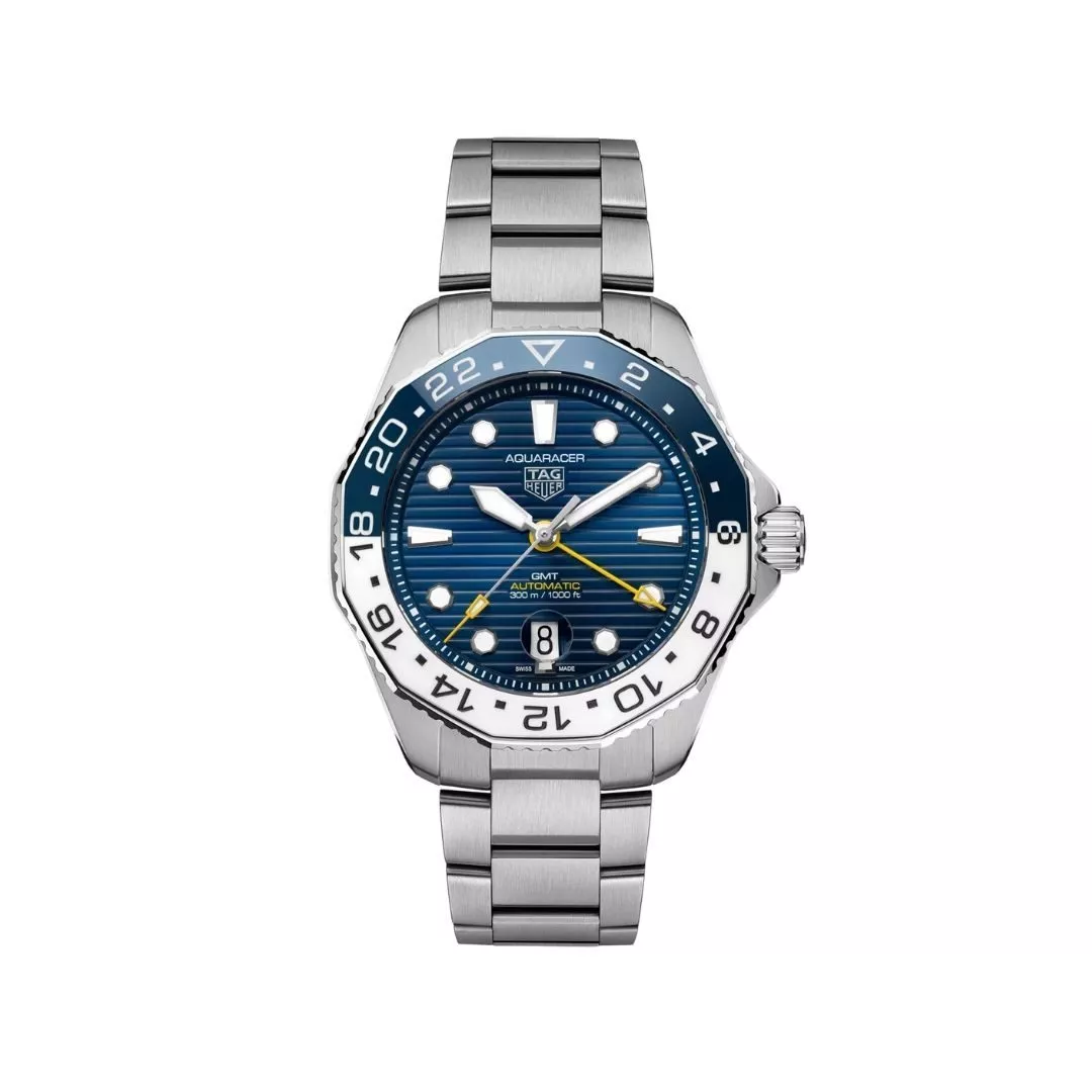 Orologio Tag Heuer Aquaracer Professional 300 GMT con cassa in acciaio da 43 mm e quadrante blu. Movimento automatico.
