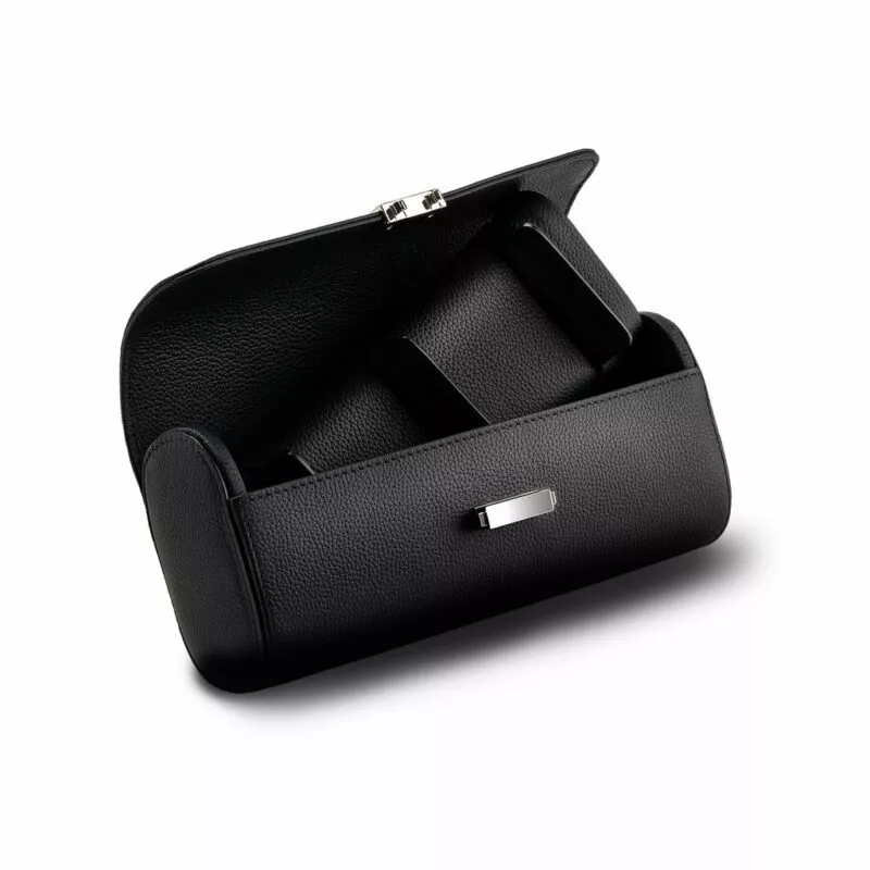 Astuccio da viaggio per riporre fino a 4 orologi di grandi dimensioni. Rivestito in pelle di vitello nera.