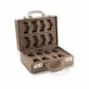 Valigetta con maniglie e chiusura a combinazione per 16 orologi di grandi dimensioni. Rivestito in pelle di vitello color castagno. Chiusure color argento.