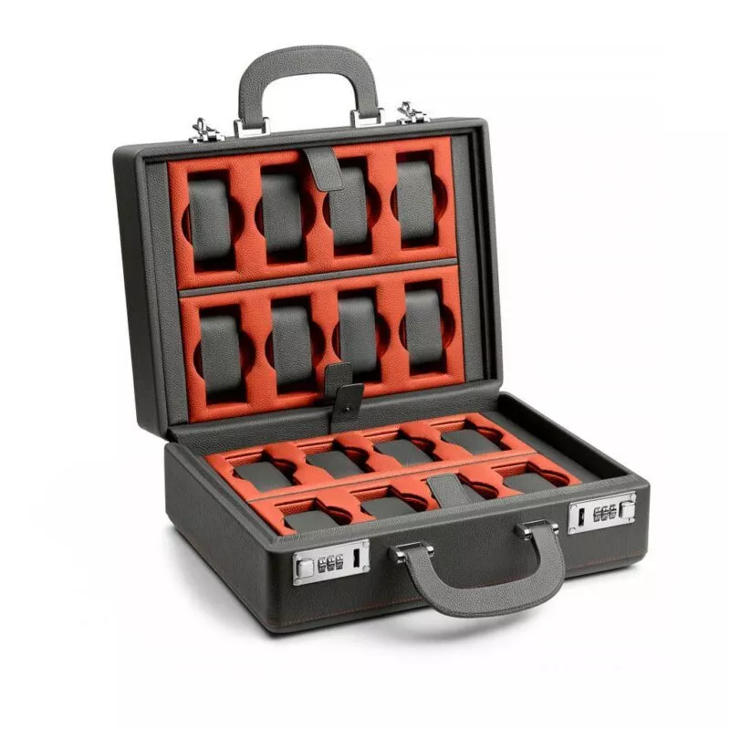 Valigetta con maniglie e chiusura a combinazione per 16 orologi di grandi dimensioni. Rivestito in pelle di vitello color grigio e arancio. Chiusure color argento.