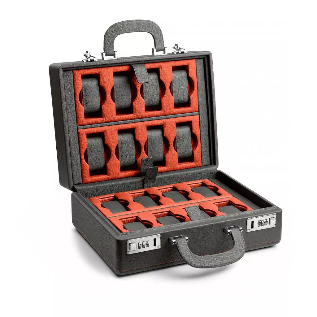 Questa valigetta con maniglie e chiusura a combinazione è progettata per riporre 16 orologi di grandi dimensioni (diametro cassa, corona inclusa, 56 mm) con cinturino rigido o in pelle.