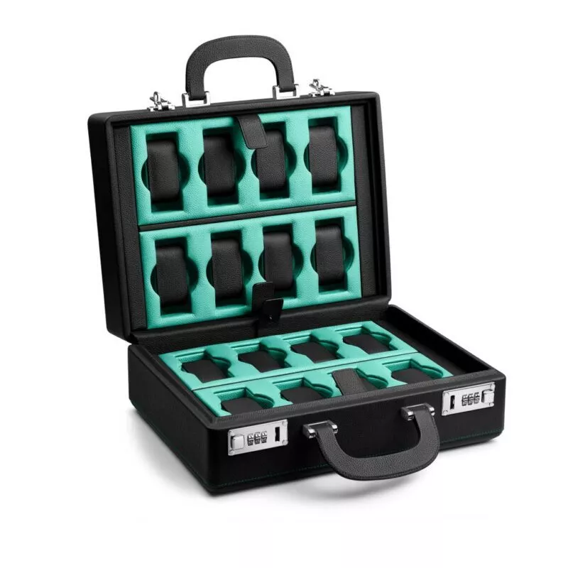Valigetta con maniglie e chiusura a combinazione per 16 orologi di grandi dimensioni. Rivestito in pelle di vitello nera e blu Tiffany. Chiusure color argento.