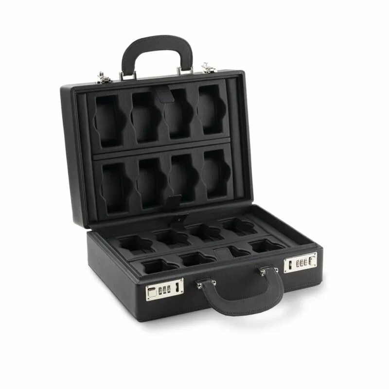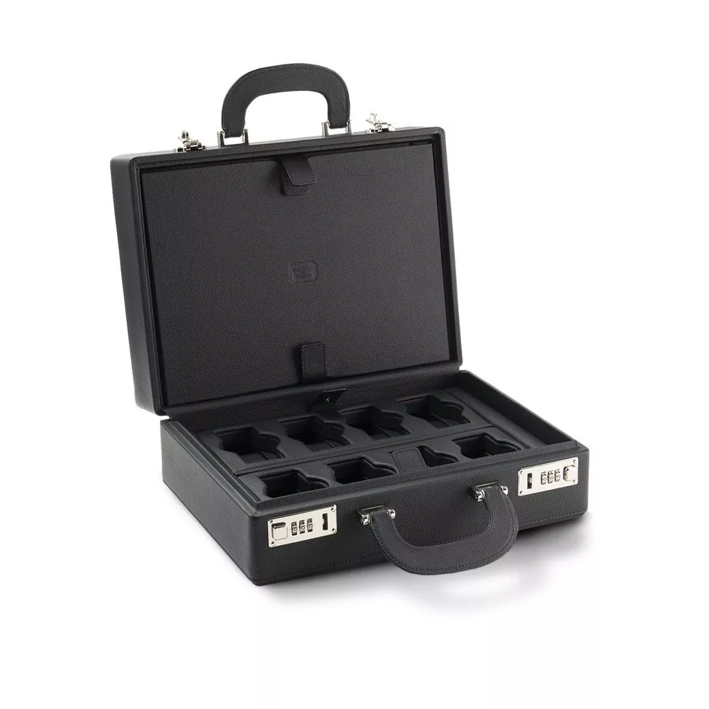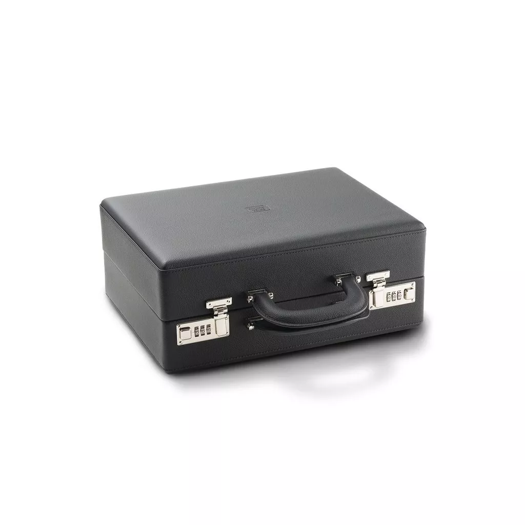 Valigetta con maniglie e chiusura a combinazione per 16 orologi di grandi dimensioni. Rivestito in pelle di vitello nera. Chiusure color argento.