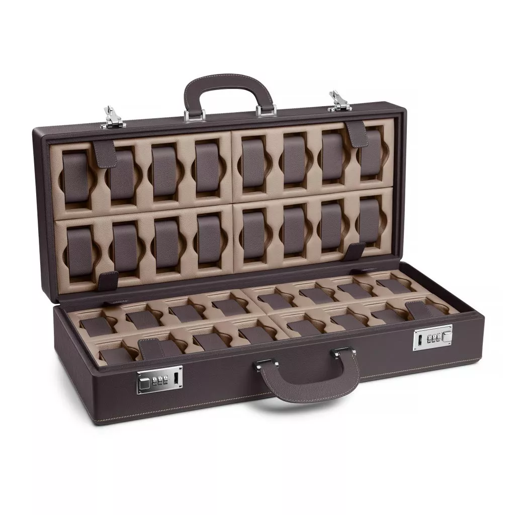 Questa valigetta con maniglie e chiusura a combinazione è progettata per riporre 32 orologi di grandi dimensioni (diametro cassa, corona inclusa, 56 mm) con cinturino rigido o in pelle.